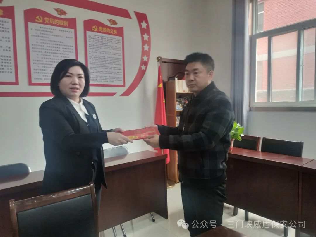 其次由党支部张滔书记宣读了三门峡分公司在本次总公司年会中的获奖情况。分别是:三门峡分公司荣获总公司“2023年度先进单位”、“2023年宣传报道先进单位一等奖”等三个集体奖;总经理侯海霞荣获总公司“2023年突出贡献奖”;牛志亚等四名保安员荣获总公司“2023年度十佳优秀保安员”等四项个人奖。同时为表彰先进,树立正气,经分公司领导班子研究决定对荣获总公司奖项的先进个人进行了二次物质奖励。保安员牛志亚同志在获奖感言中激动地说:非常感谢公司各级领导对我们基层队员工作的认可与厚爱,决心在今后的工作中以更加饱满的热情投身于安保服务工作中,更加努力进取,责任担当,以更加优异的成绩回报公司。