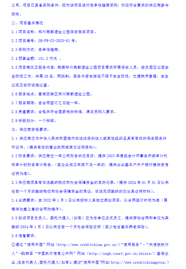 郑州商都遗址公园保安服务项目竞争性磋商公告