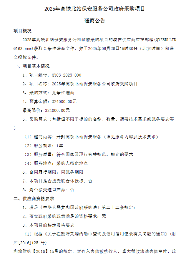 2025年高铁北站保安服务公司政府采购项目-磋商公告