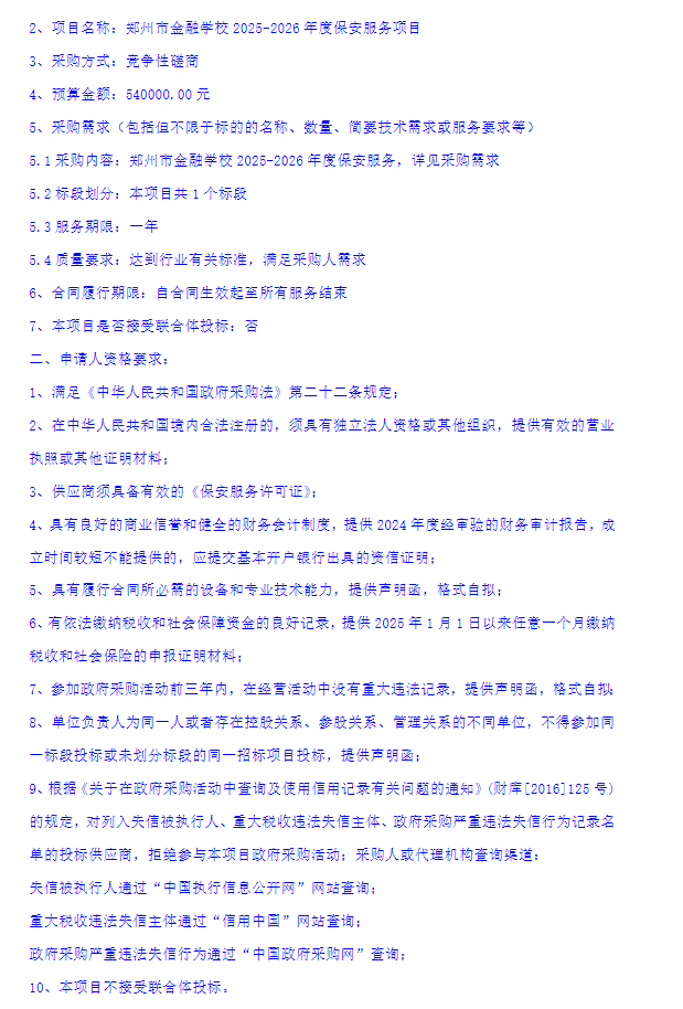 郑州市金融学校2025-2026年度保安服务项目竞争性磋商公告