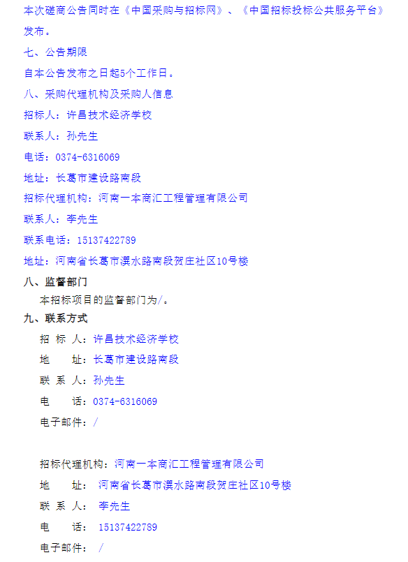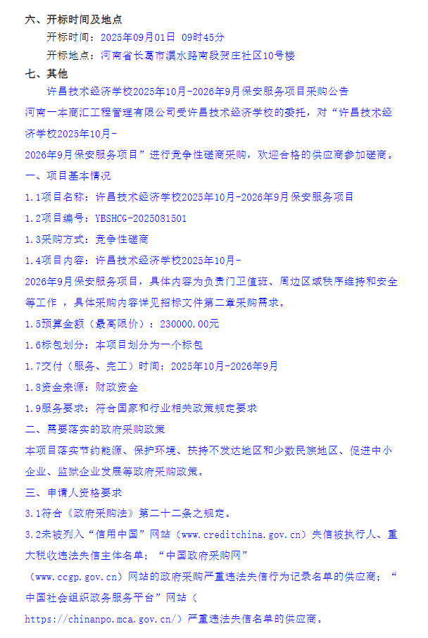 许昌技术经济学校2025年10月-2026年9月保安服务项目采购公告