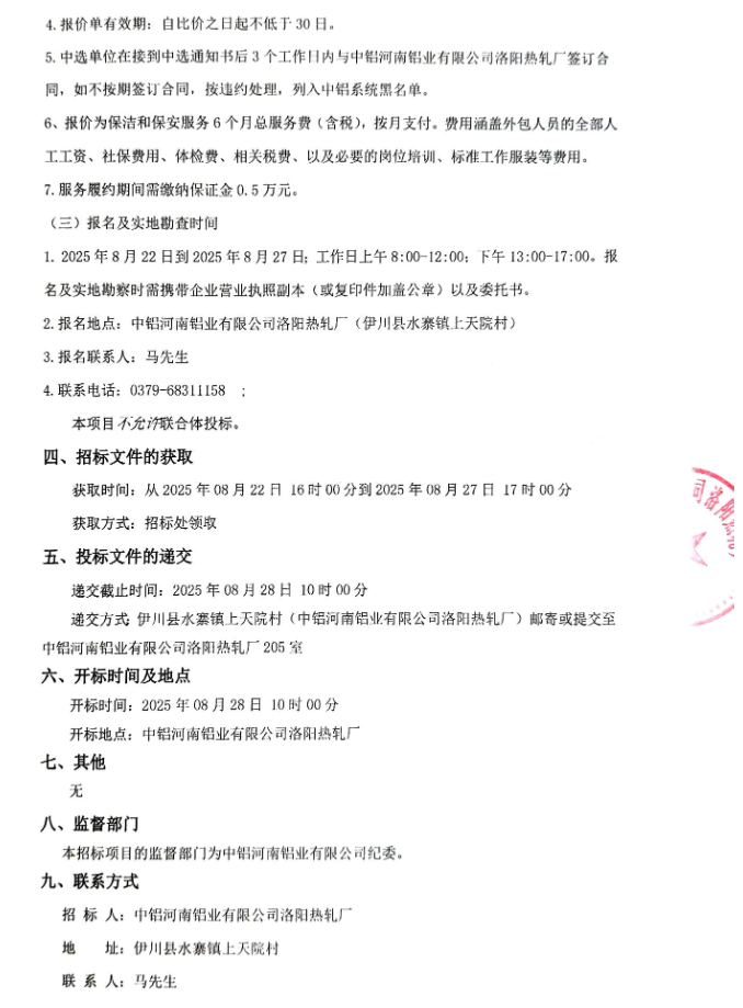 中铝河南铝业有限公司洛阳热轧厂保安服务和保洁服务外包项目
