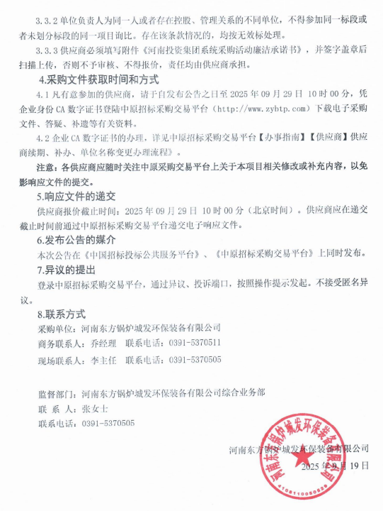 河南东方锅炉城发环保装备有限公司2025年物业服务谈判采购采购公告