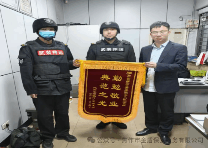 10月25日,沁阳农商银行山王庄支行主管代表单位,向焦作金盾沁阳守押大队三号车组郑重赠送锦旗。这面锦旗不仅是一份荣誉见证,更是合作客户对车组专业素养与尽责担当的高度认可,凝聚着双方在长期协作中的信任与肯定。
