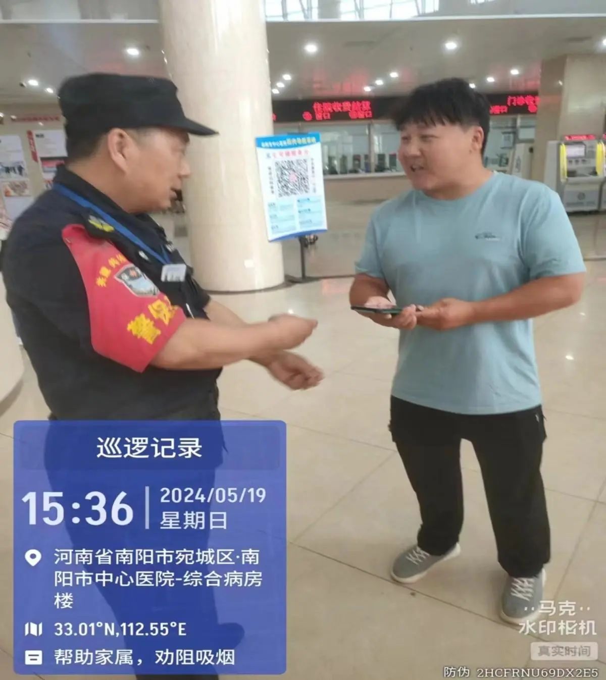 5月19日13时30分许,巡逻队员张青祥在七号楼大厅巡逻时,发现导诊台上有人遗失一部手机,他就在大厅里边巡逻边等候。直到失主打过来电话,张青祥在确认无误的情况下,便将手机归还失主。失主感激不已,马上拨打12345,对保安同志们“拾金不昧”的精神进行点赞。