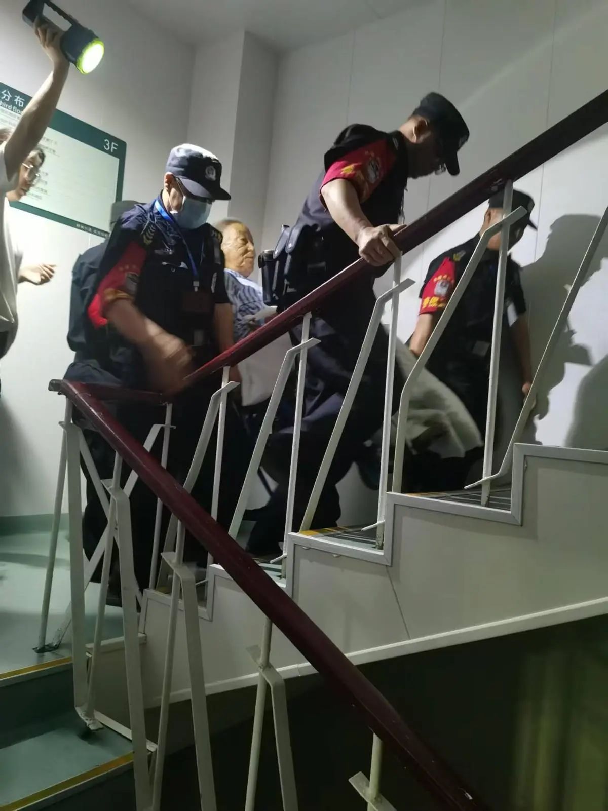 5月28日,这位先生体重有200多斤,需要到4楼做内镜检查,为了安全起见,王队亲自在前面抬着轮椅,几保安同志齐心协力把他抬了上去,等到做完检查又把他抬了下来。