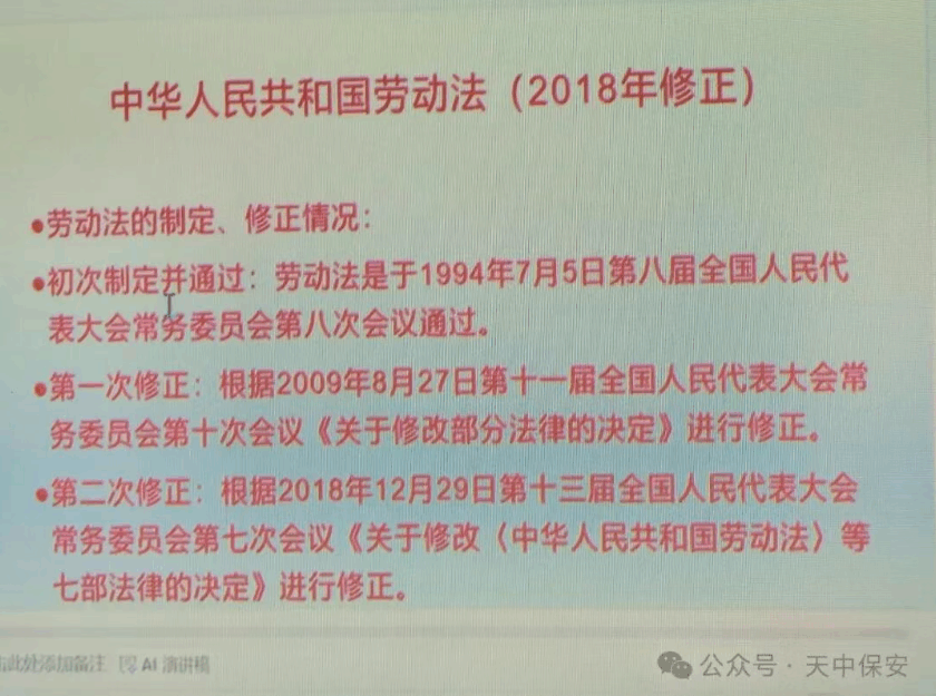 培训由公司专职法务吴海雨律师担任主讲,授课内容以2018年修正版《中华人民共和国劳动法》为核心,结合公司实际管理场景进行了系统化、通俗化的解读。在培训课件中,吴律师首先梳理了《中华人民共和国劳动法》的立法与修正脉络,从1994年首次颁布,到2009年、2018年两次修正的历程,让参训人员明晰了法律条款的演变逻辑和时代背景。