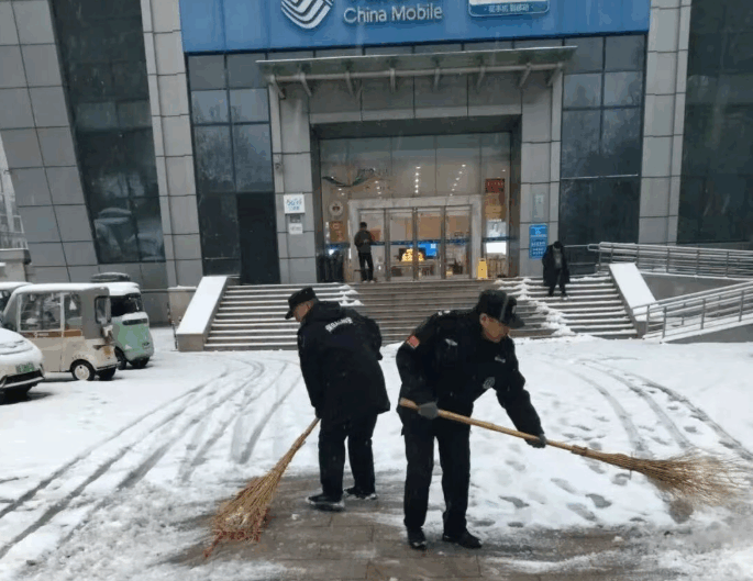 在多个机关单位和企事业单位门口,队员们顶着寒风,连续作业数小时,确保车辆进出顺畅、员工通勤安全。他们不仅清理主干道,还细致清理人行通道、台阶、坡道等易滑区域,防止意外发生。