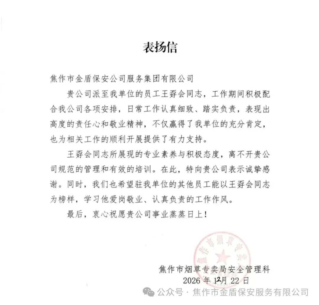焦作金盾人防七部保安员受到客户单位表扬