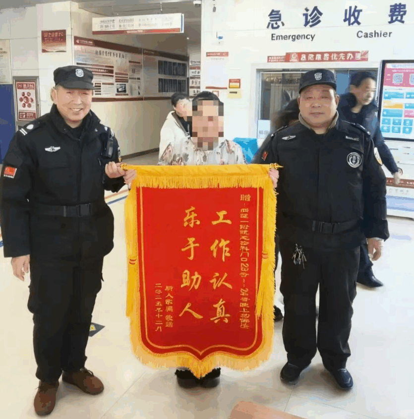 得知情况后,赵金喜、侯交生立刻赶往现场,全程协助家属完成患者的转运、检查台的抬放工作,检查结束后又将患者安全送回。次日患者再次做核磁时,两人更是主动上前帮忙,暖心举动让家属倍感温暖。12月25日,家属带着一面写有“工作认真 乐于助人”的锦旗来到医院,专程向两位保安表达感激。