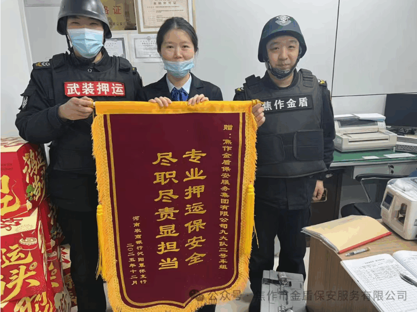 12月27日,焦作金盾押运部沁阳守押大队二号车组迎来了一份特殊的认可——河南农商银行谭怀支行将一面印着“专业押运保安全 尽职尽责显担当”的锦旗送到车组队员手中,以此感谢队员们长期以来在武装押运工作中展现的专业素养与责任担当。