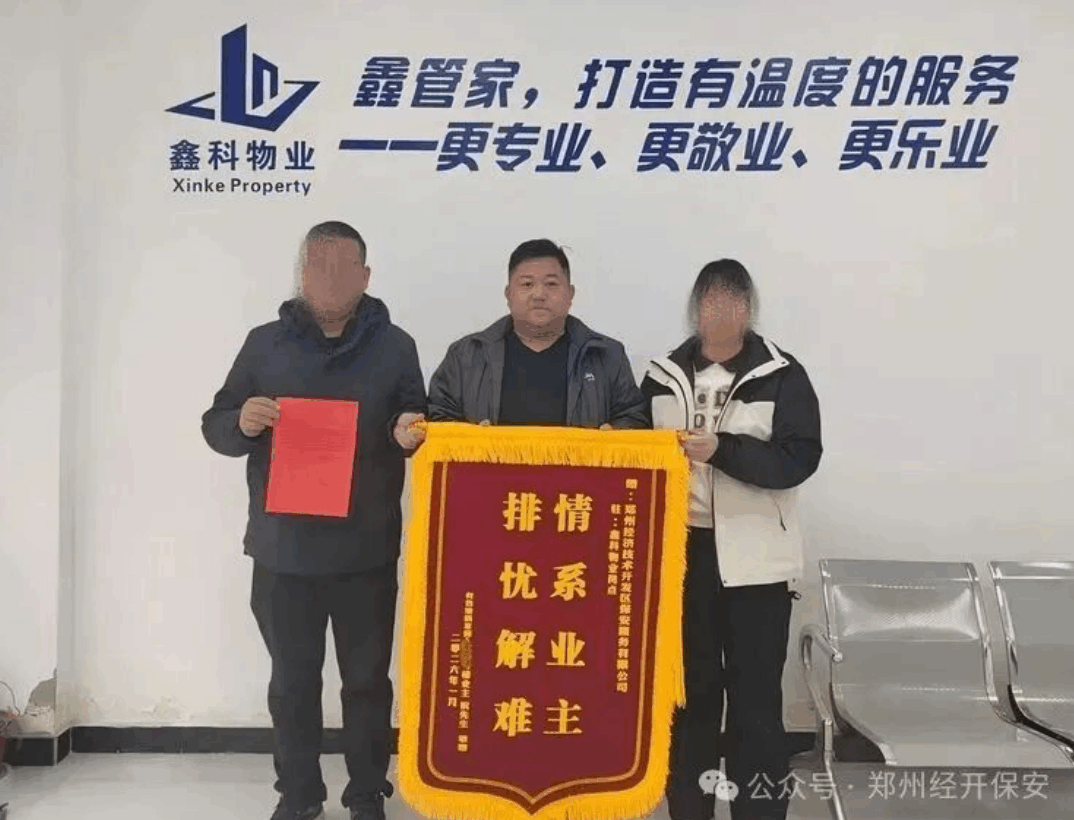 2026年1月14日上午,郑州保安集团经开分公司队员闫新芳、李建鹏收到了一面承载着感谢与认可的锦旗,这是岗点业主祝先生专程送来的心意,这面锦旗既是对两位队员暖心服务的真诚肯定,也是对我公司保安团队专业素养的高度赞誉。
