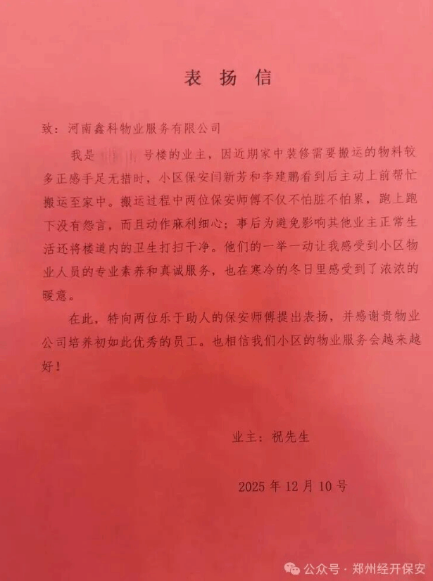 此前,祝先生家中装修需搬运大量物料,繁杂的工作量让他犯了难。闫新芳和李建鹏在日常巡查时敏锐发现这一情况,并主动伸出援手。二人不畏脏累、不辞辛劳,多次上下奔波,搬运过程中既迅速又周到,搬运结束后还仔细清理了楼道卫生,避免给其他住户带来不便。这份贴心举动让祝先生在冬日里倍感温暖与感动,他先是写下情真意切的表扬信道出感激,又于1月14日特意将锦旗亲自送到两位队员手中。