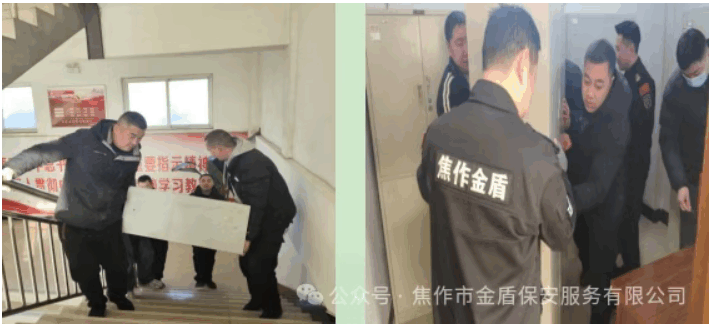 1月13日上午,焦作市金盾保安服务公司马村守押大队在保障日常押运勤务安全有序的前提下,主动协助客户单位马村农商行完成办公柜体搬运工作,以实际行动践行“客户至上、服务为本”的工作理念。