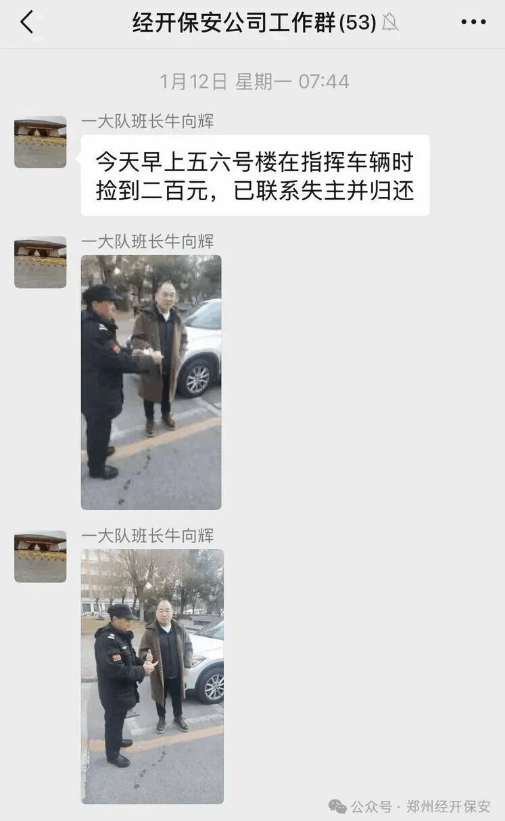2026年1月12日上午7时许,郑州保安集团经开分公司第七人民医院岗点保安员王中书在指挥院内车辆时,发现一位车主前往门诊大厅就诊途中掉落二百元现金。他当即高声呼喊,及时唤回车主,并将现金如数归还。此一拾金不昧的举动传递了正能量,赢得了失主与周边群众的连连称赞。