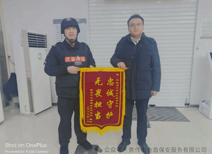 1月20日下午,焦作市保安服务有限公司工行守押大队孟州车组收到孟州支行送来的锦旗,锦旗上“忠诚守护、无畏担当”的字样,既是对车组工作的肯定,更是对守押队伍责任与使命的褒奖。