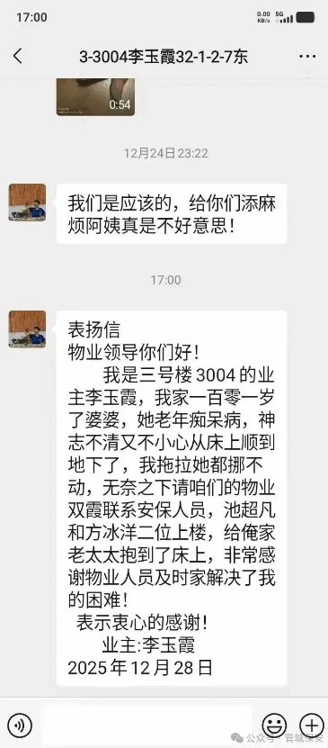 2025年12月24日深夜23时,宇通家属院内队员池超凡、方冰洋按照惯例正在巡逻,此时接到物业孙经理用对讲机紧急通知:“3号楼3004业主电话求助,说家中的百岁老人行动不便并患有老年痴呆,不小心从床上滑到地上了,业主靠自己无力搀扶她婆婆到床上,需要紧急帮助”。接到通知后,保安队员池超凡、方冰洋暂放下手头的工作,一路小跑,火速赶往业主家中,二人先安抚3号楼3004业主的情绪并询问情况,按照公司平时训练应急处置技巧,协助业主一起将老人安置到舒适的位置休息,全程细致周到,确认老人平安才放心离开。