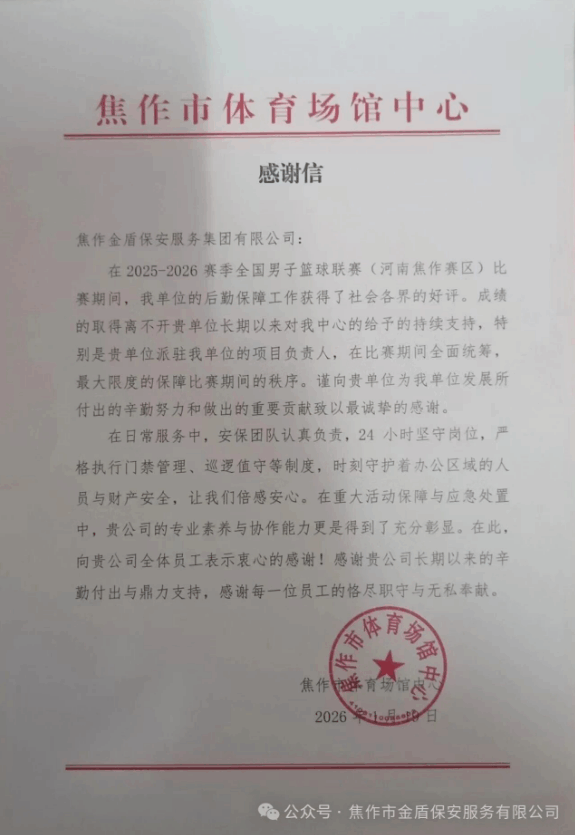 在2025-2026赛季全国男子篮球联赛(河南焦作赛区)期间,人防一部、二部、七部、八部凭借优质的安保服务赢得客户单位称赞。
