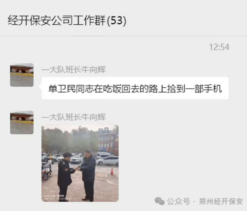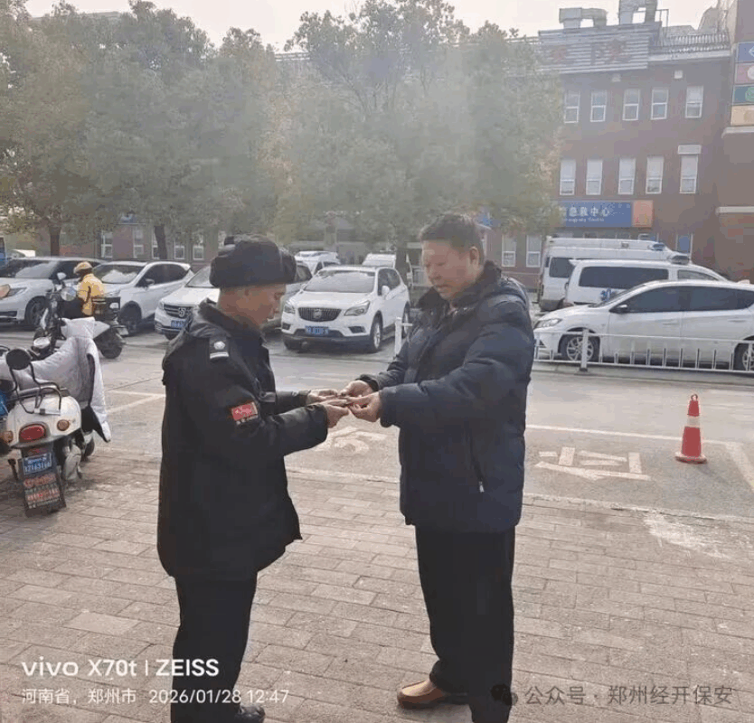 2026年1月28日中午,郑州保安集团经开分公司第七人民医院岗点保安员单卫民,在就餐途中拾获一部手机。没有丝毫犹豫,他第一时间将手机妥善保管并迅速上报,随后多方联络,最终成功找到失主,将手机完壁归赵。