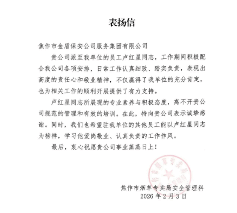 2026年2月3日,焦作金盾人防七部驻河南省烟草公司焦作市公司保安员卢红星、申建设由于日常工作认真细致,踏实负责,其爱岗敬业精神得到了客户单位的肯定,受到了表扬。