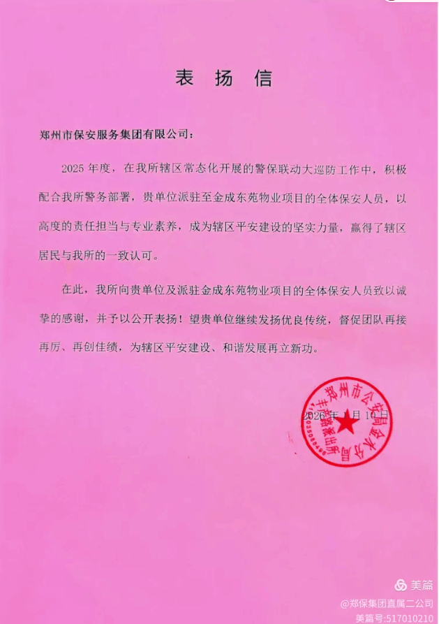 近日,郑保集团直属二公司收到郑州市公安局金水分局丰产路派出所发来的表扬信,对郑保集团直属二公司派驻金成东苑物业项目的全体保安人员在2025年度警保联动大巡防工作中的突出表现予以公开表彰。