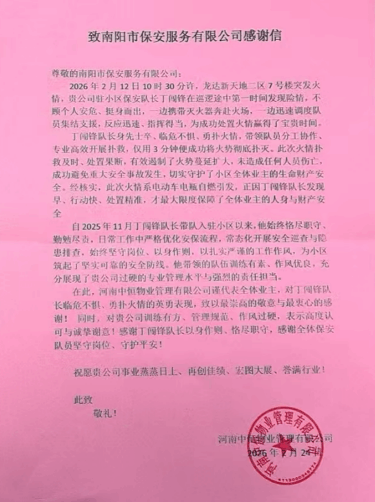 感谢信中说,“河南中恒物业管理有限公司谨代表全体业主,对丁闯锋队长临危不惧、勇扑火情的英勇表现,致以最崇高的敬意与最衷心的感谢!同时,对贵公司训练有方、管理规范、作风过硬,表示高度认可与诚挚谢意!感谢丁闯锋队长以身作则,恪尽职守,感谢全体保安队员坚守岗位、守护平安!”