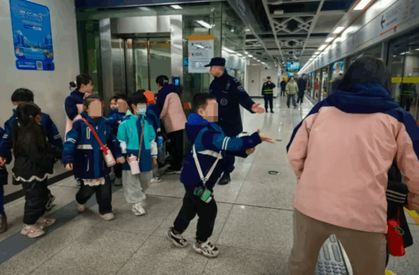 安检班长担当“守护使者”,细致指引3名老师及21名小朋友团队乘车和换乘。
