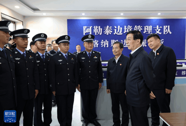 9月27日,受习近平总书记嘱托,中共中央政治局常委、全国政协主席、中央代表团团长王沪宁带领中央代表团部分成员到阿勒泰地区布尔津县考察。这是王沪宁和中央代表团部分成员在喀纳斯边境派出所看望慰问基层干警。新华社记者 姚大伟 摄