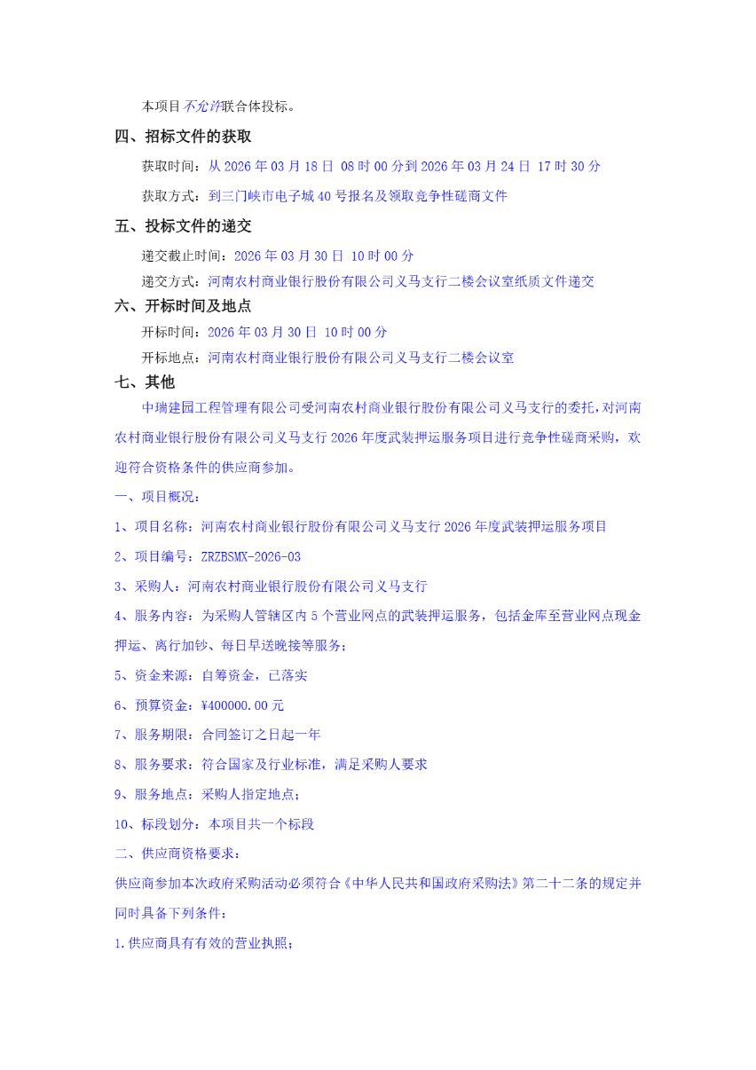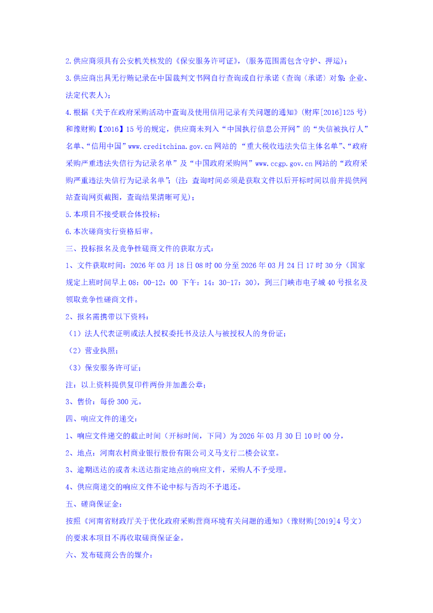 河南农村商业银行股份有限公司义马支行2026年度武装押运服务项目竞争性磋商公告