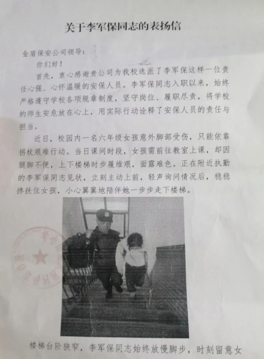 长期以来,焦作金盾人防五部保安员李军保安保工作认真负责、爱岗敬业、热情服务、爱护学生,得到客户单位师生们的认可与好评。近日,九里山小学送来一封表扬信称赞其“爱校如家 护生如子”,这是对李军保的表扬,也是对公司安保服务质量的肯定。