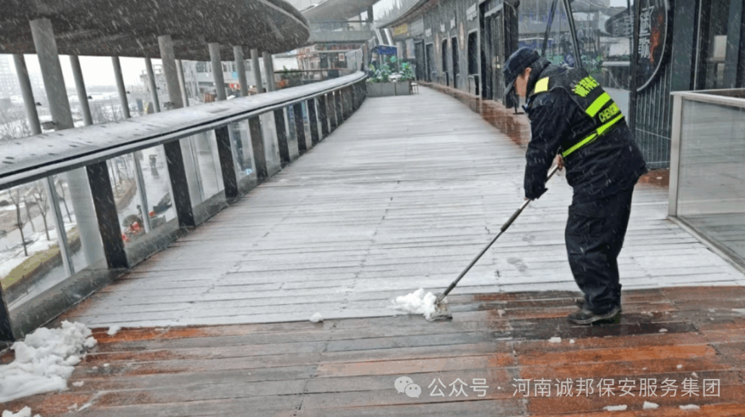 诚邦商业项目的队员在第一时间就有组织有纪律的用工具清扫起地板上的积雪,每一位队员都深知自己肩上的责任,他们用实际行动诠释着“用心守护,安全常在”的服务理念。