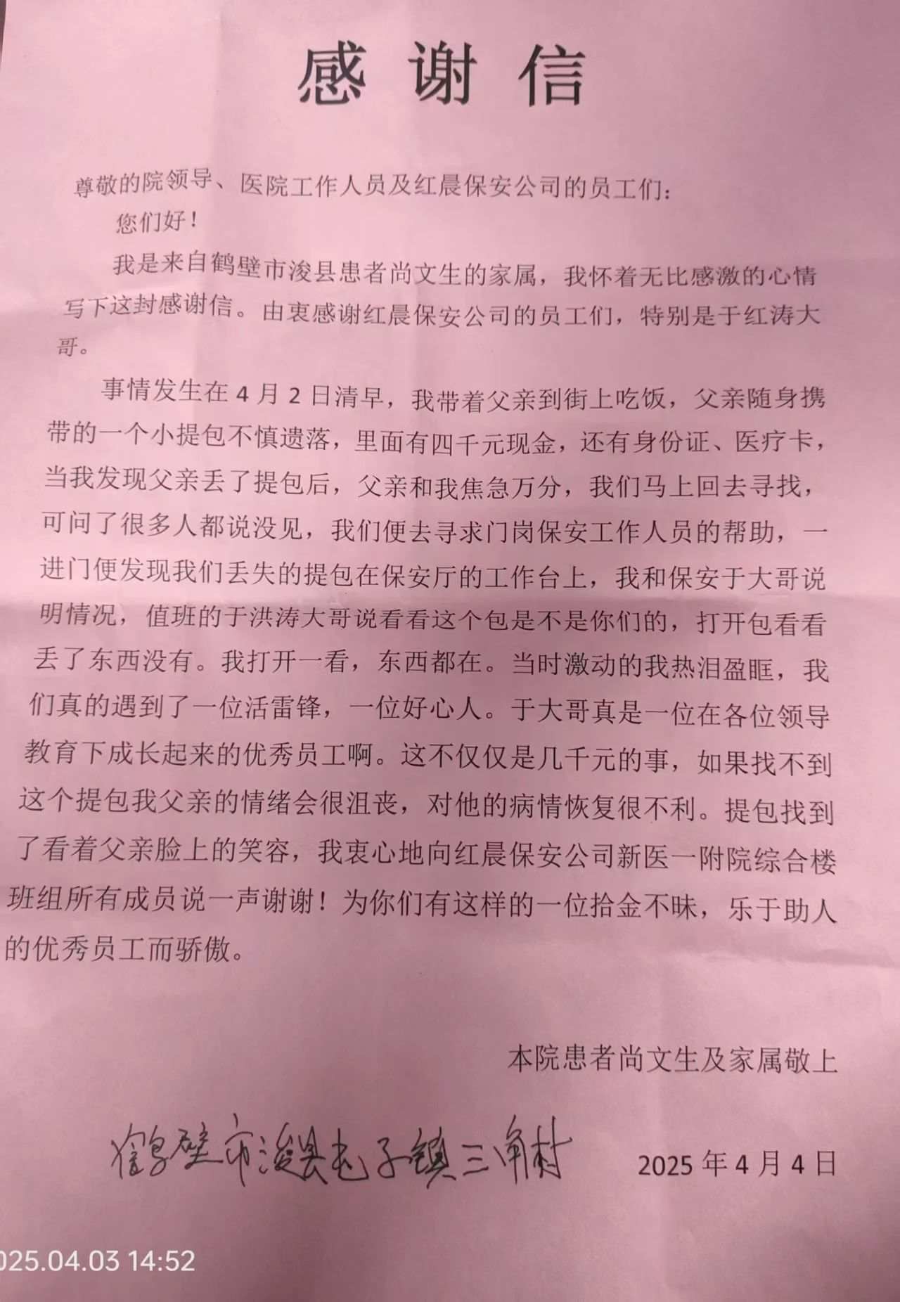 第二天下午,老人的家属再度来到了9号楼的保安处。一面鲜艳的锦旗和一封感谢信被紧紧攥在手中。家属的眼神中满是真诚的谢意,他郑重地将锦旗递到保安手中,那锦旗上“拾金不昧,乐于助人”八个烫金大字在阳光下熠熠生辉,“太感谢你们了,要不是你们,我们可真不知道该怎么办了!”家属嘴里不住地感谢着。