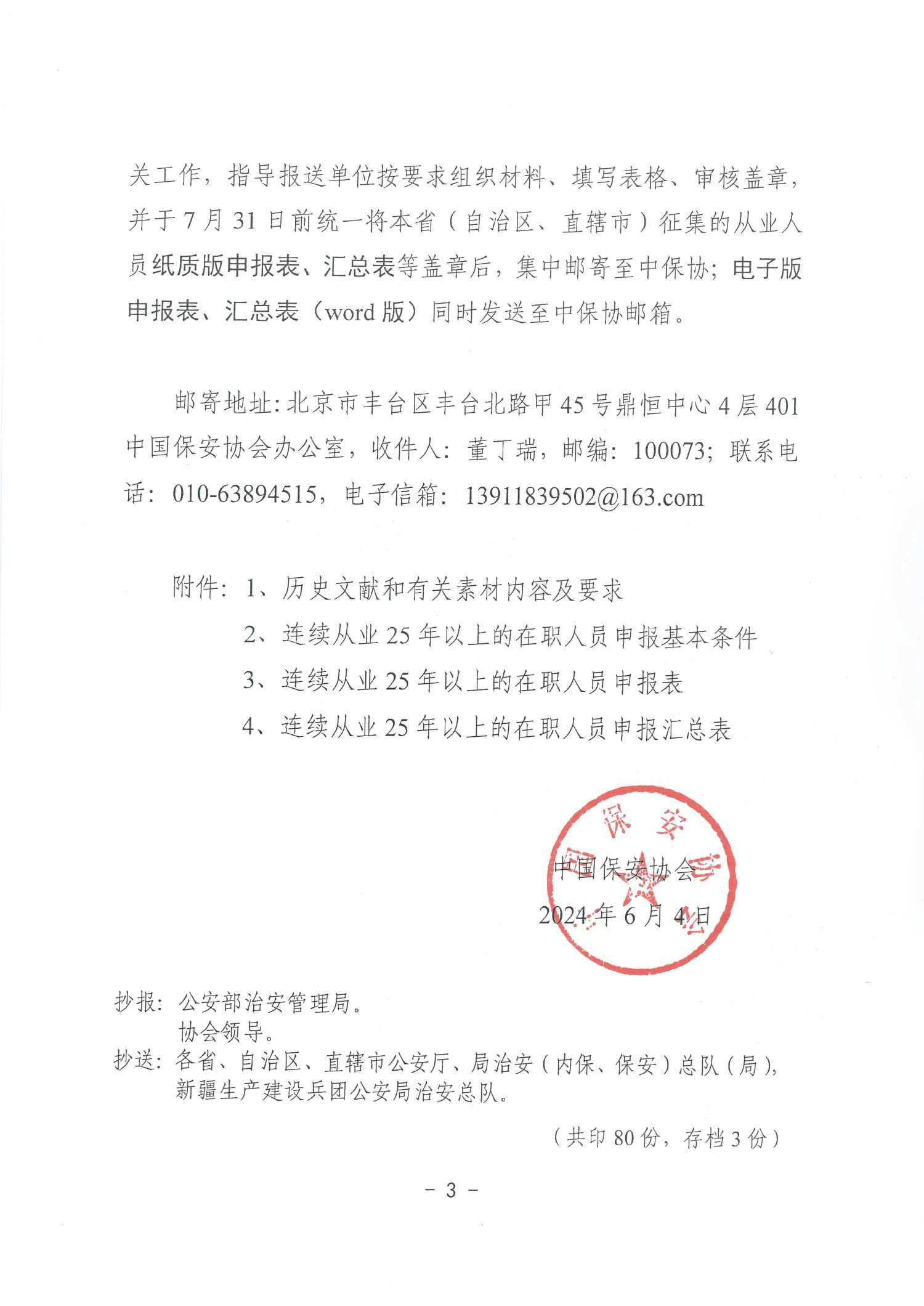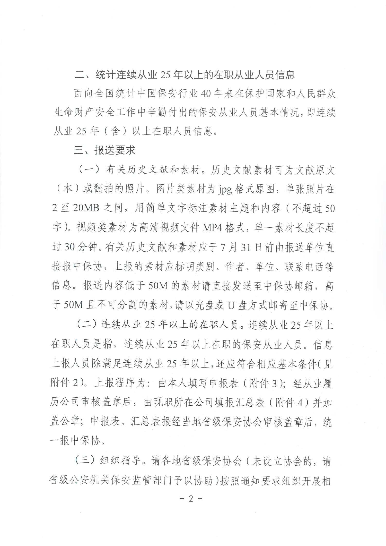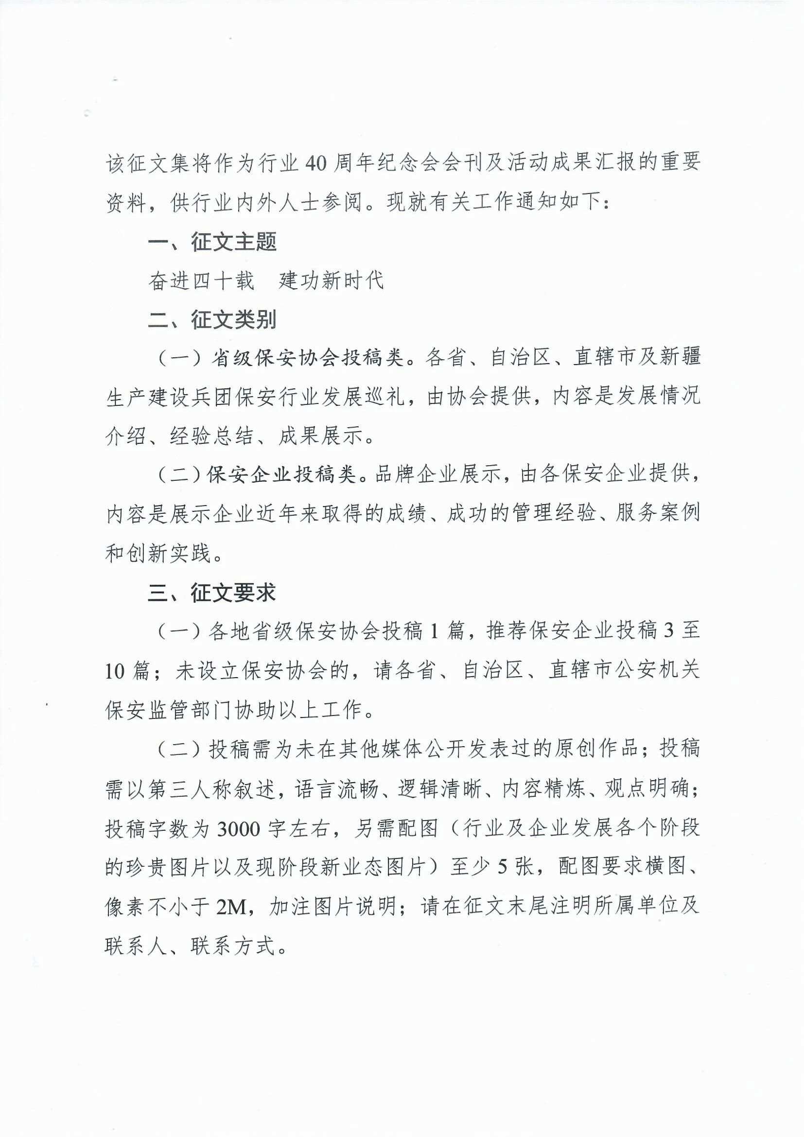 近日,中国保安协会下发《“奋进四十载 建功新时代”征文活动通知》(中保协(2024)11号)《首届全国保安行业短视频大赛作品征集活动通知》(中保协(2024】12号)《关于征集纪念中国保安40周年有关素材的通知》(中保协(2024】13号),部署开展纪念中国保安40周年素材征集活动,现将通知转发给你们,请结合本单位实际踊跃参与,按照通知要求准备素材,分别按以下时间报送省保安协会: