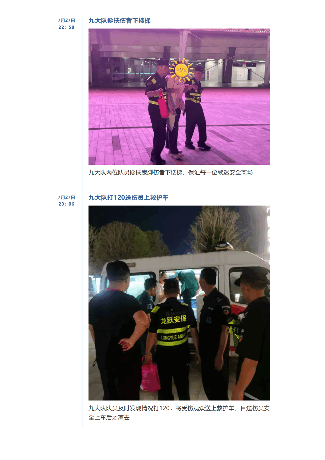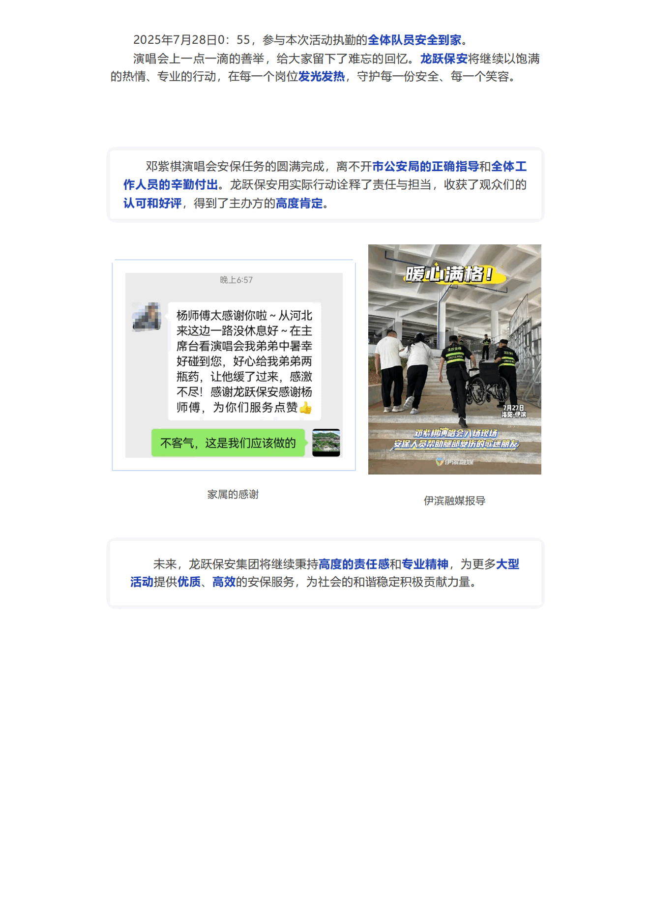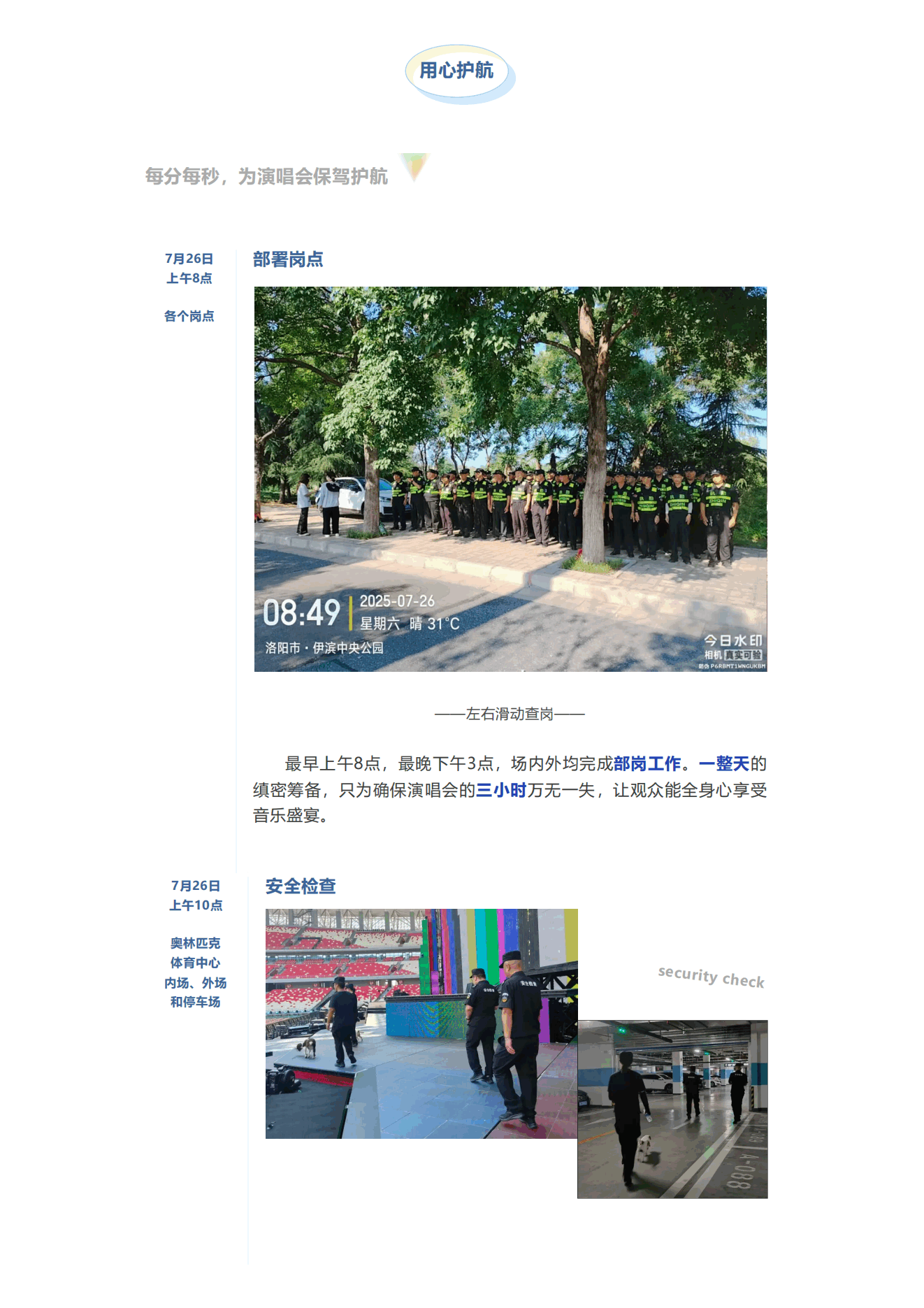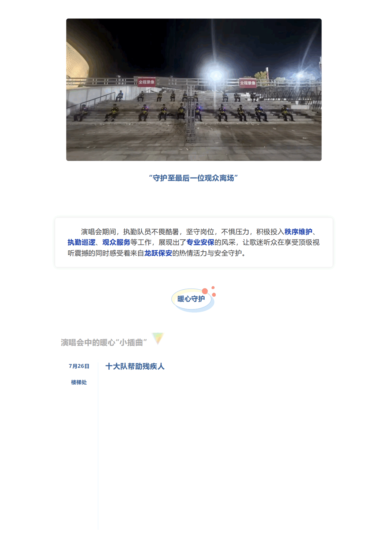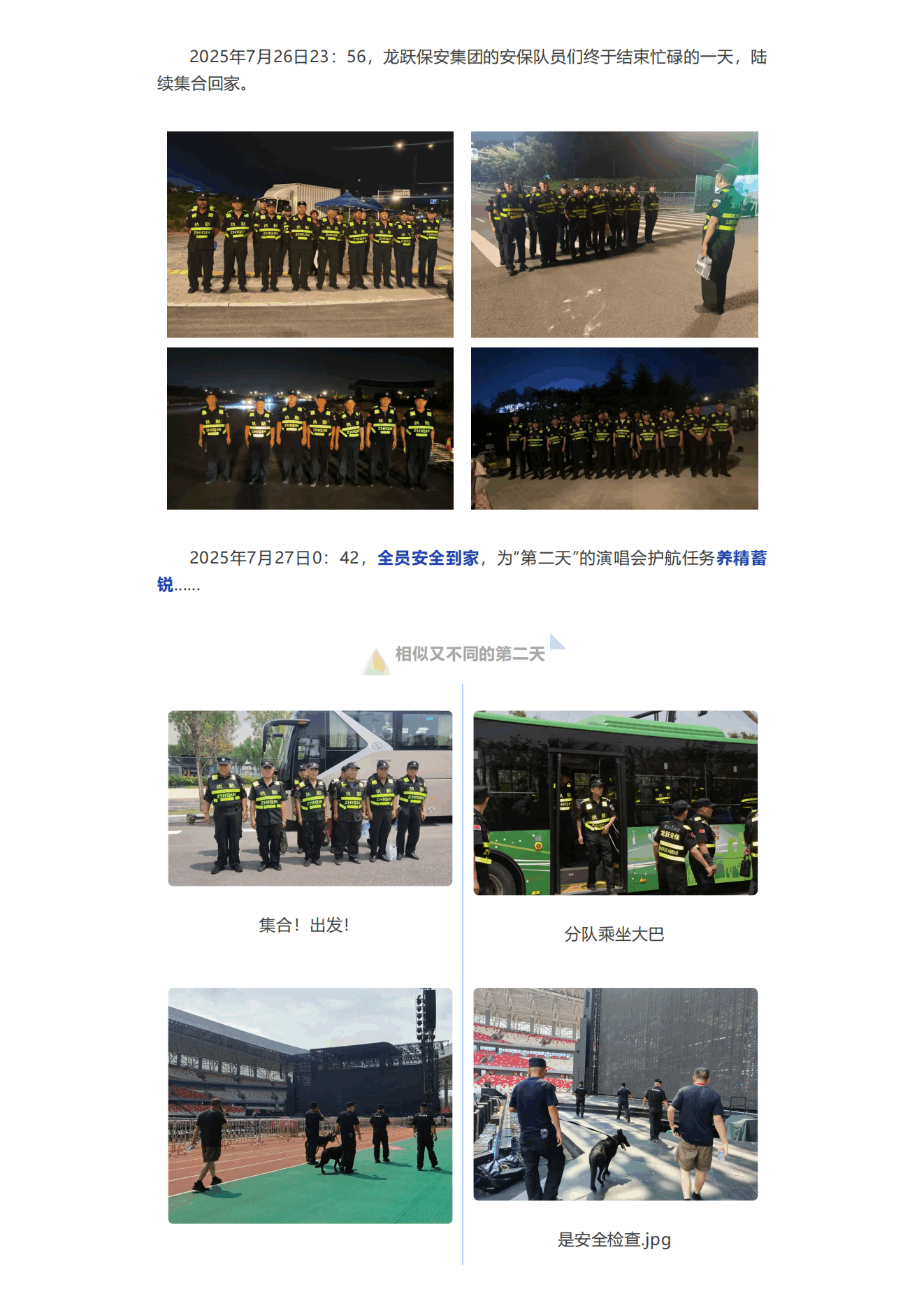 2025年7月26日、27日晚,备受瞩目的邓紫棋 I AM GLORIA 世界巡回演唱会(洛阳站)在洛阳奥林匹克中心体育场双日唱响。河南龙跃保安服务集团有限公司以专业素养和丰富经验,圆满完成本次演唱会的安保任务,为演唱会的顺利进行保驾护航。
