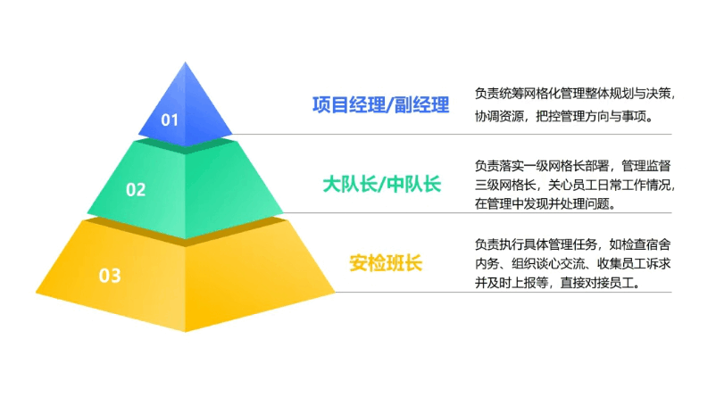 借鉴成熟经验,我们建立了项目经理/副经理、大队长/中队长、安检班长三级联动的宿舍网格化管理体系:一级网格长负责统筹规划、资源协调与方向把控;二级网格长负责落实执行、区域协调与日常管理;三级网格长负责具体执行(如检查内务、组织交流、收集上报诉求),直接服务队员,确保“小事网格解决,大事协同响应”。