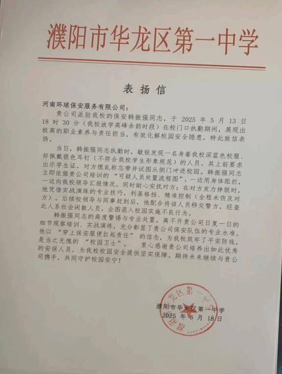 这份纯粹的雀跃背后,藏着河南环球保安服务有限公司提前数十日的默默守护:从夏夜灯光下反复研讨的防护方案,到训练场里汗湿衣襟的实战演练;从逐件清点的安保装备,到逐校排查的设施隐患,他们以“等不起”的紧迫感扎实筹备,早早按下校园安全防护升级的“启动键”。“人防提能”是队员们把应急处置流程刻进肌肉记忆的较真,“物防提质”是手中防暴盾牌映出的责任光芒,“联防提效”是与校方反复磨合出的无缝协作,“技防提标”是智能监控里24小时不眨眼的守护——这“四维联动”织就的,不只是一张安全防护网,更是给孩子的成长撑起的“平安伞”。