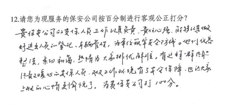 每一份反馈都是前行的动力,每一位客户的声音都是最好的“指南针”。未来,我们将不断提高服务质量,忠诚履行职责,把客户建议转化为服务升级的具体行动。以更优质、更专业的服务,筑牢安全防线,让客户放心,让客户满意。