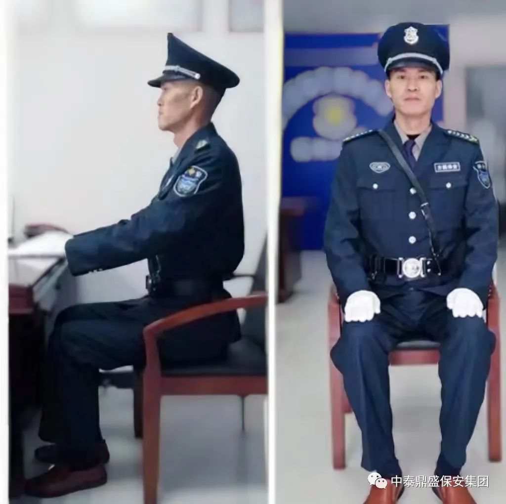 脚尖呈60度左右打开,有桌子时双手自然搭放在桌面上(如图所示),无桌子时双手自然搭放在双腿上(如图)。见到巡检或业主要起立表示尊重。