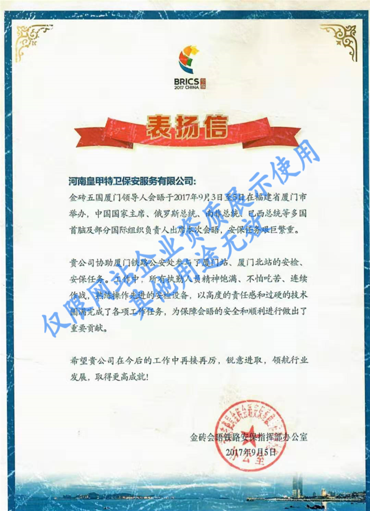 展望未来,皇甲特卫将进一步树立保安服务品牌意识,推动新型保安服务项目、产品开发和应用,提高保安服务科技含量,积极投身社会治安防控体系建设,在深入推进社会治理创新、建设更高水平平安中国中作出贡献。