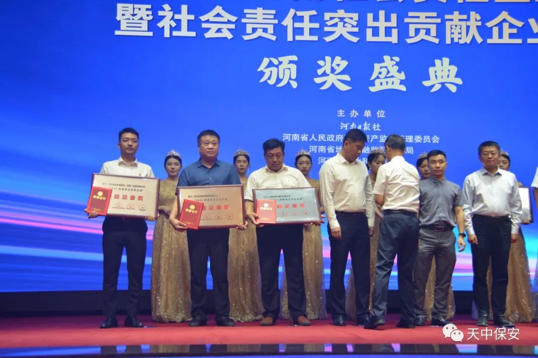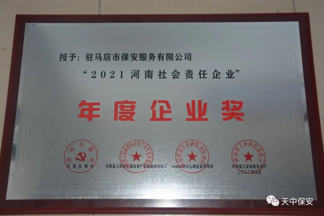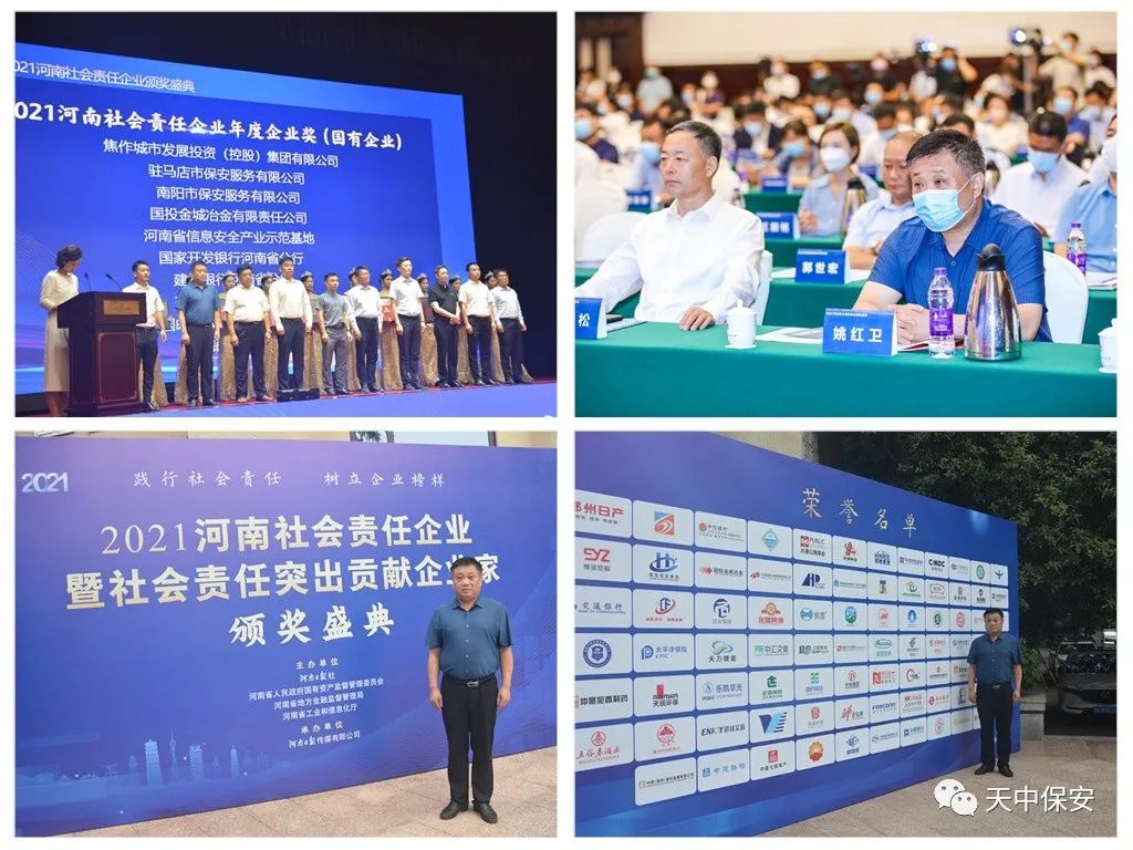 7月2日下午,由河南日报社、河南省人民政府国有资产监督管理委员会、河南省地方金融监督管理局、河南省工业和信息化厅联合主办的“2021河南社会责任企业及社会责任突出贡献企业家”推选活动颁奖典礼在郑州黄河迎宾馆迎宾会堂举行。2021河南社会责任企业有500余家企业报名参加,经过资料审核、网络投票、媒体公示、专家评审等环节,最终推选出了88家热心公益事业、有责任、有担当、无私奉献的社会责任企业。驻马店市保安服务有限公司成为我市唯一当选“2021河南社会责任企业”的国有企业受到表彰。公司连续2年被评选为“河南社会责任企业”。