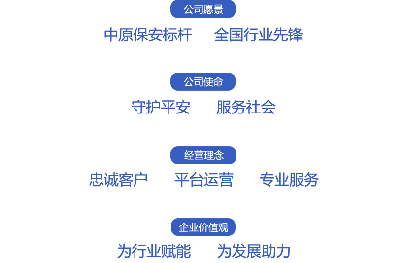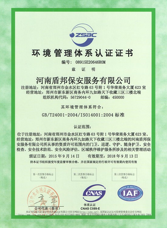 集团旗下河南盾邦保安服务有限公司是中国保安协会、郑州市公共安全防范行业协会会员单位,公司建立了拥有各类技术人才的技术防范团队,获得了河南省公安厅颁发的安防资质,以专业化、规范化的服务理念,以人防、技防相结合的服务方式,服务于企事业单位、医院、学校、金融机构、公共服务设施、治安协勤、房地产项目、旅游景点、大型文化娱乐活动、展会、商会、知名人士的临时(特殊)保安服务、停车场管理等诸多领域。