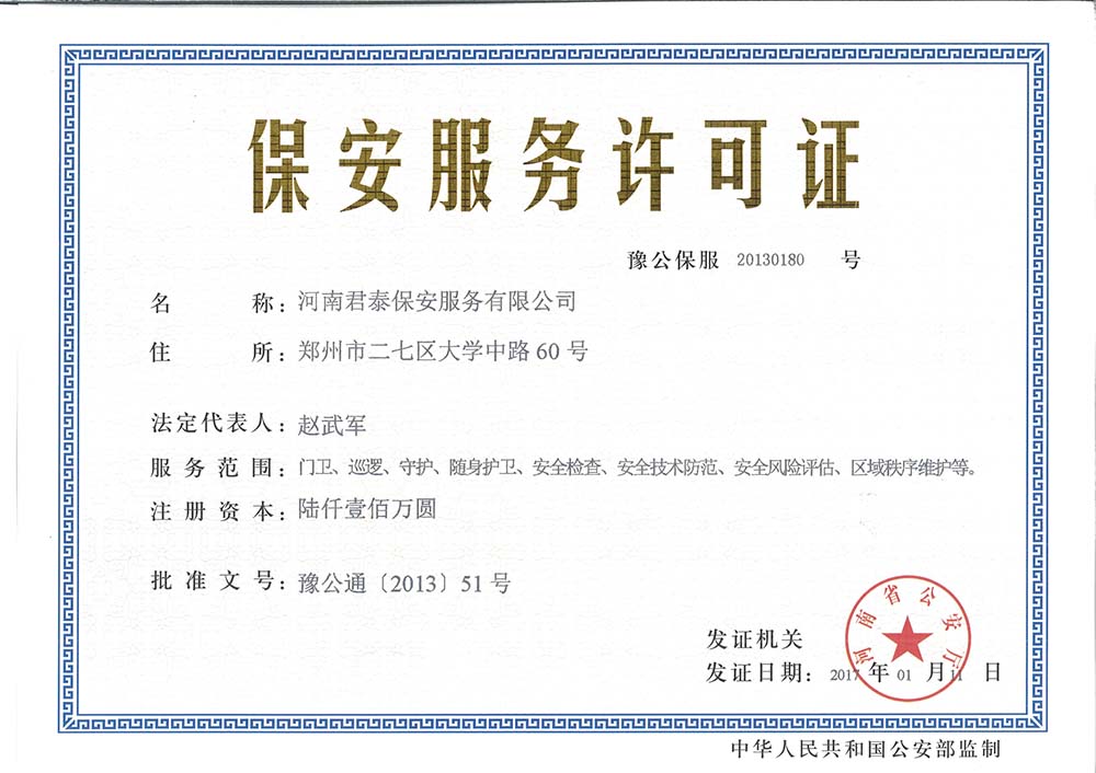 河南君泰保安服务有限公司是一家集保安服务(人防、技防、门卫、巡逻、护卫、安检与武装守押)﹑保安人员培训等于一体的保安服务公司,是经河南省公安厅2013(05)号文批准成立的专业保安服务企业,是经郑州市工商行政管理局登记注册成立的保安服务公司,是具有专业化、规范化、科学化、现代化的服务型企业。