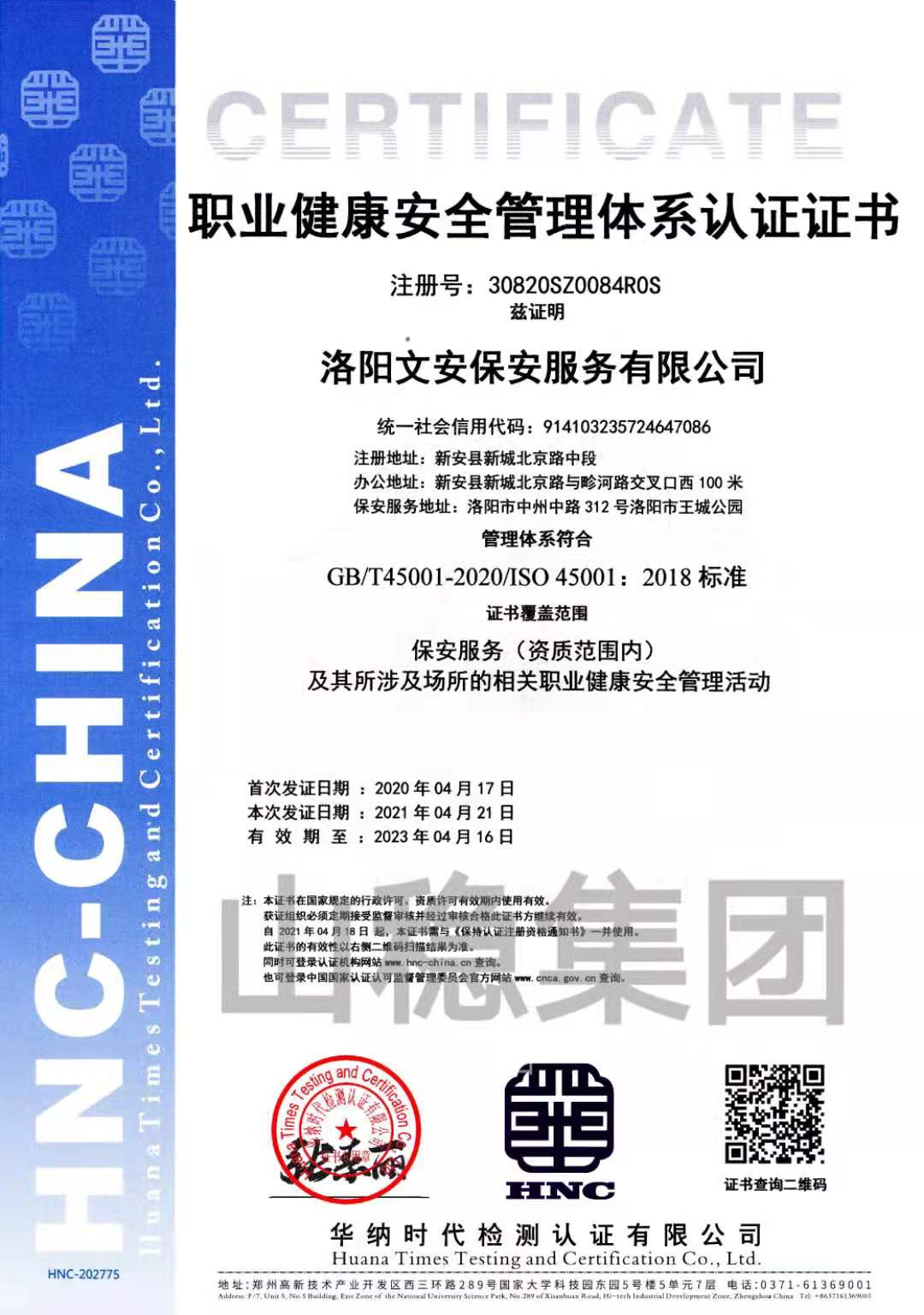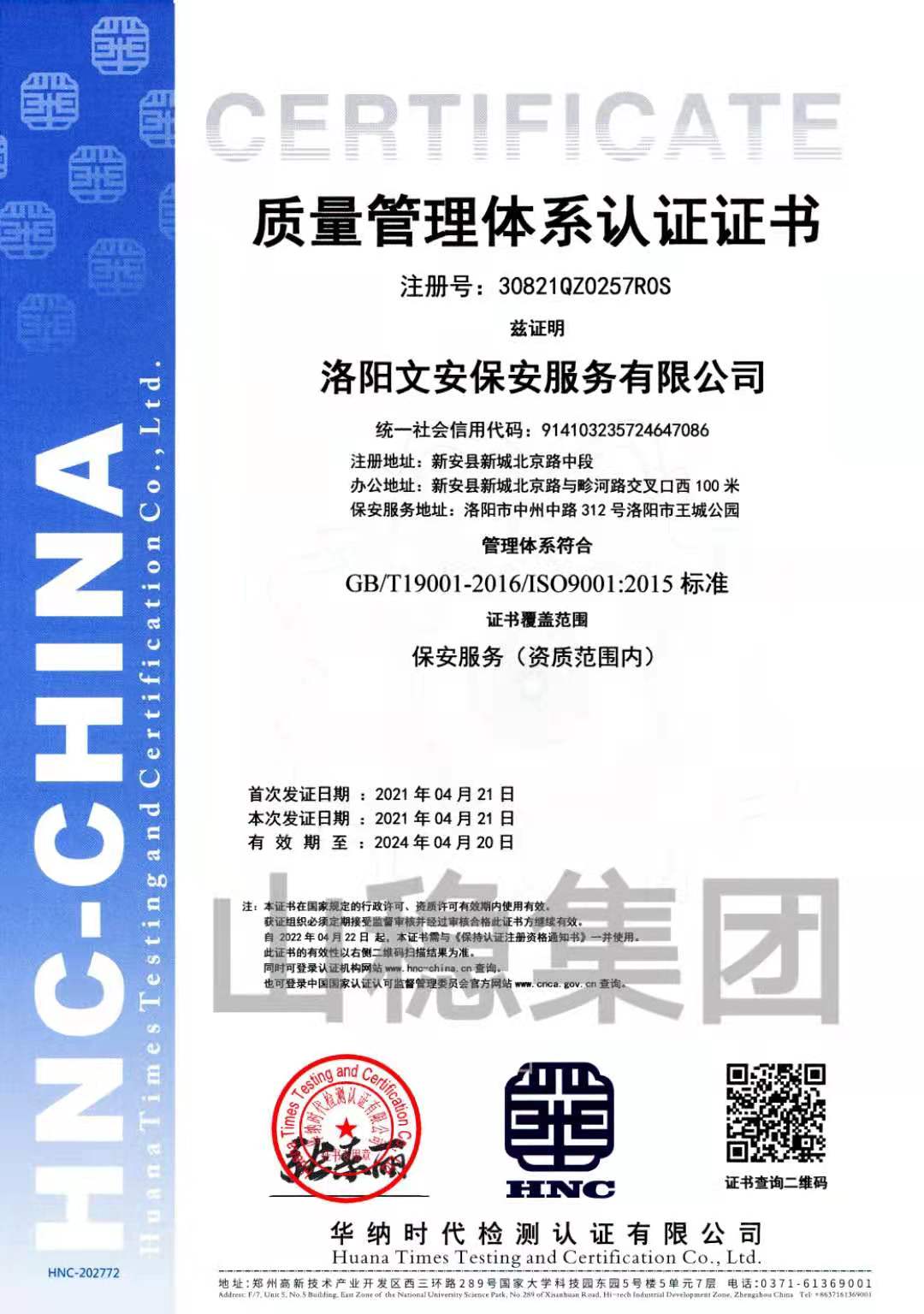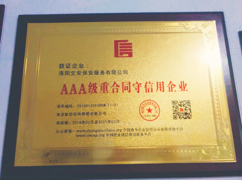 公司系河南省保安服务协会理事单位、洛阳市保安协会会长单位,先后荣获河南省、洛阳市先进保安服务公司荣誉称号,取得了ISO9001质量管理体系认证证书、AAA级企业信用等级证书、AAA级重合同守信用企业证书、立信单位证书。