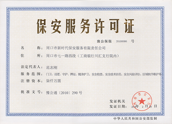 周口市新时代保安服务有限责任公司,注册资金7000万元,注册地址在周口市七一路西段18号(工行银行川汇支行院内),现办公地址在周口市黄河路西段公安局综合楼4-6楼。