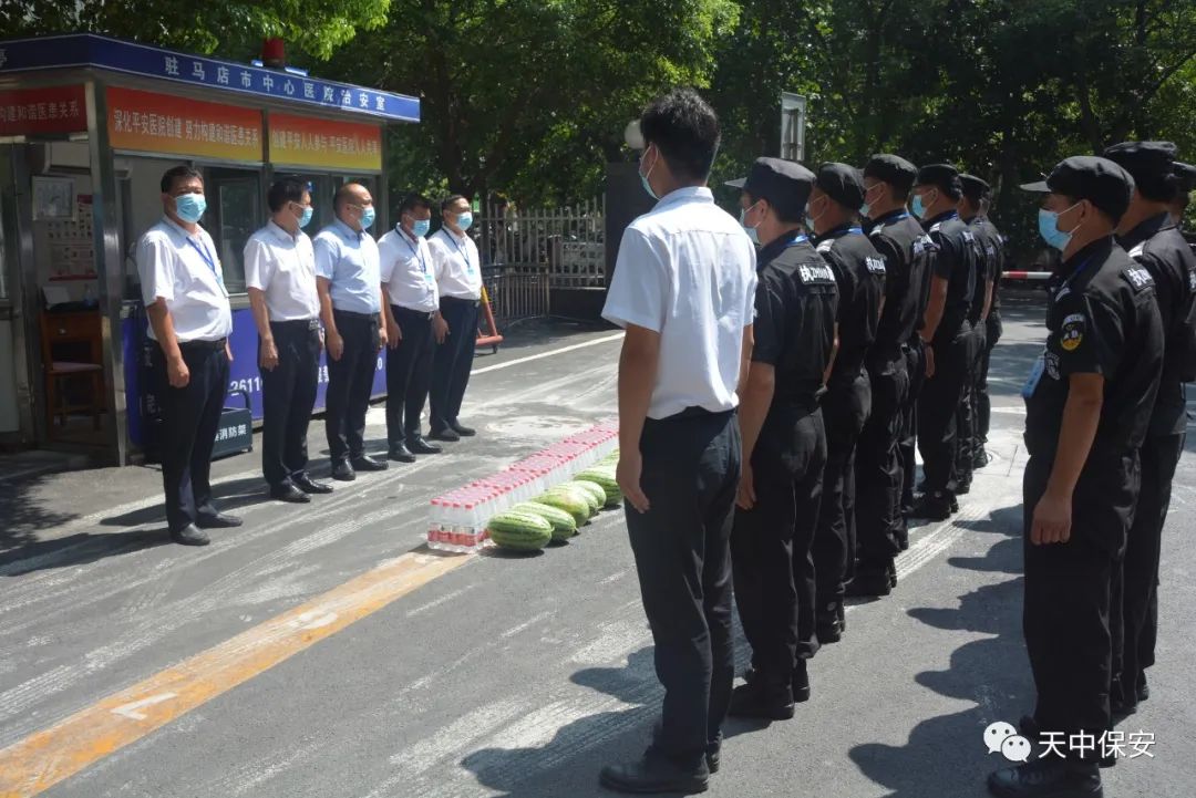 烈日当空,骄阳似火。近期我市迎来持续高温天气,8月11日上午,驻马店市保安服务有限公司总经理张建辉,公司党总支副书记魏炜,副总经理邓继国、张延春,与公司机关、分公司机关相关人员一起,先后前往高铁站辅警岗点、中心医院执勤岗点、市农行押运中队、车管所执勤岗点、公司修理厂和技防分公司技术部等基层单位看望慰问一线员工。