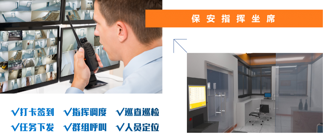 对于物业员工管理,为其专门研发了“保安官”移动端APP,以实现员工考勤签到、任务下达、指挥调度、协同办公、岗位划分等管理。通过指挥中心三维可视化端,对社区全貌进行1:1还原建模,搭配APP的定位功能,指挥中心可以随时查看员工位置、信息,进行语音视频通话、下发各类任务信息等。让物业对基层员工的管理和指挥调派如臂使指,更为精准高效的利用人力资源。