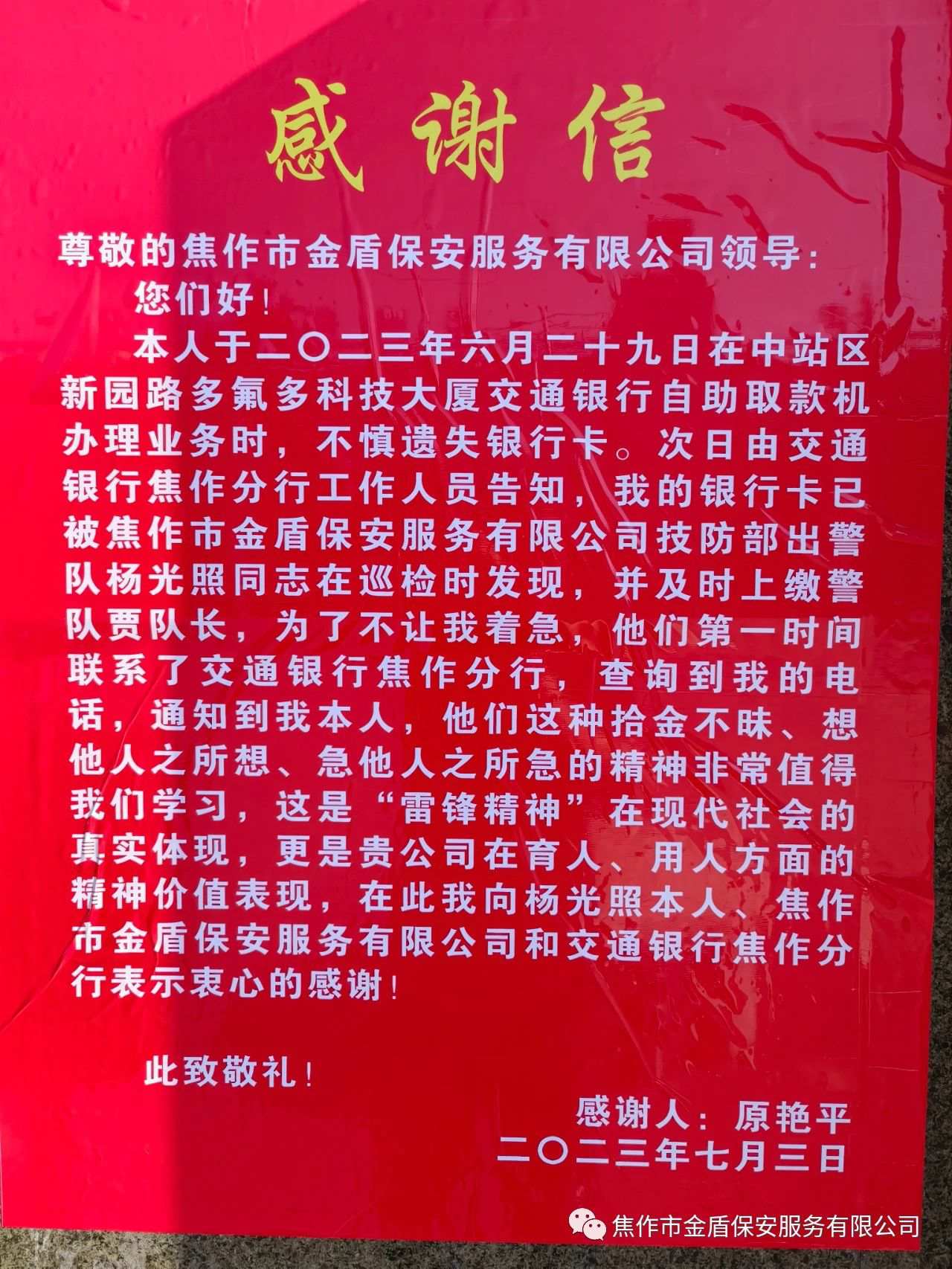 7月4日,失主原某带着感谢信来到出警队认领其丢失的银行卡,原某说:“这种拾金不昧、想他人之所想、急他人之所急的精神非常值得学习,这是"雷锋精神"在现代社会的真实体现,更是贵公司在育人、用人方面的精神价值表现,在此我衷心的感谢!”。夜间巡查队员的事迹也得到了客户单位及公司相关领导的认可和好评。