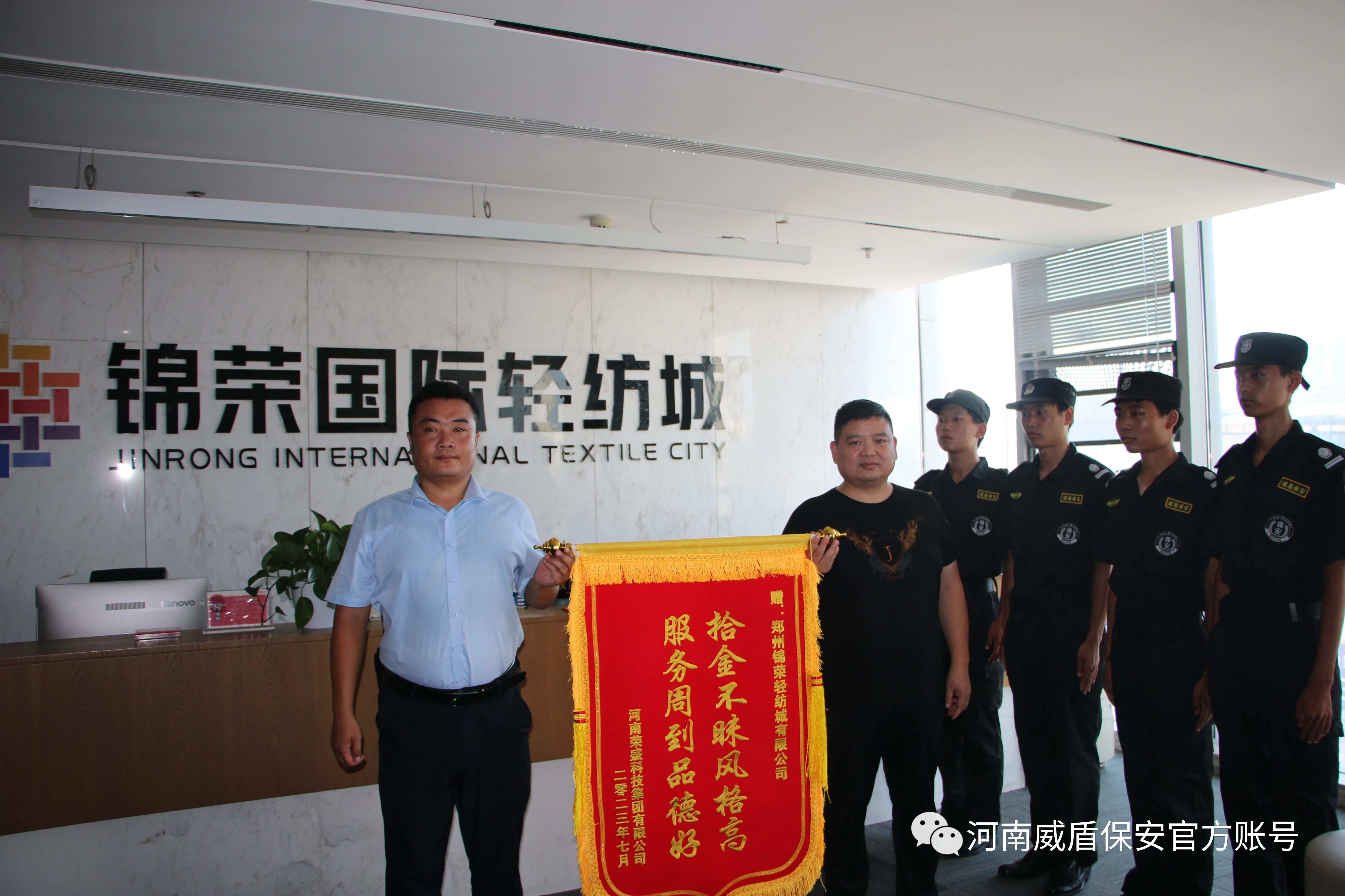 近日,河南荣盛科技集团有限公司负责人将一面绣有“拾金不昧风格高 服务周到品德好”的锦旗送到锦荣国际轻纺城保卫部,对该项目河南威盾保安服务有限公司保安员尽职尽责看护其车内物品没有丢失而专门送上锦旗以示谢意。
