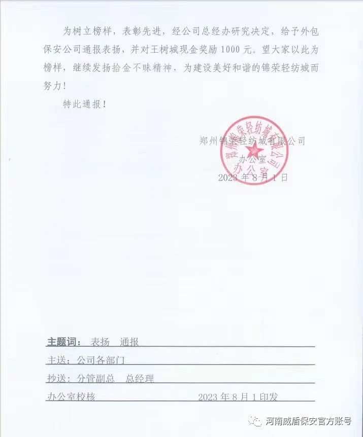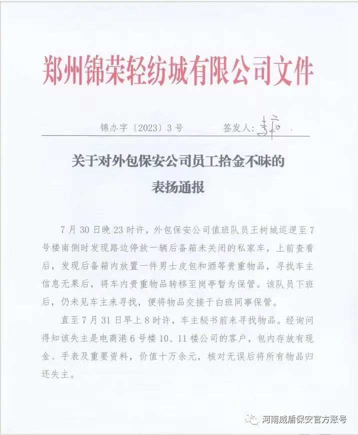 8月1日,锦荣轻纺城有限公司专门给予保安公司——河南威盾保安服务有限公司通报表扬,发布了《关于对外包保安公司员工拾金不昧的表扬通报》,并对安保人员王树城现金奖励1000元。记者在采访中了解到,自今年5月1日威盾保安公司进驻郑州锦荣轻纺城以来,威盾保安队员帮助失主找回手机、钱包、身份证等事情10余起,协助公安机关抓获窃贼一名。威盾保安队员正是用尽职尽责的态度,认真细致地工作,热情周到的服务,切实保障了市场的安全和良好的治安秩序,彻底赢得了业主的信任。