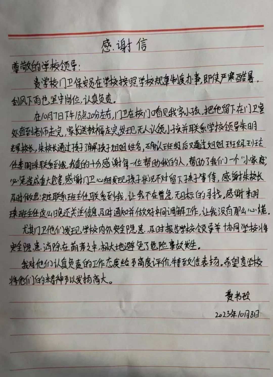 10月7日晚上6点20分左右,公司驻袁庄小学保安员钱丽君在晚上学校放学时段站护校岗时,细心的她发现校门口站着一位四、五岁小男孩一直在左右徘徊,等护校岗结束后,小男孩仍站在原地发呆,钱丽君走上前去问道:“小朋友,你妈妈在哪里呀?我带你去找妈妈好吗?”因小男孩年纪尚小,不能准确地提供有效信息,加之天色渐暗,出于安全考虑,她便将小男孩带到门卫室照看。面对陌生环境,小男孩有些拘谨,沉默不言,钱丽君不断安抚他的情绪,小男孩逐渐放下了戒心,口齿不清的说着要找姐姐。等到所有学生安全离校后,仍未见有家长来找孩子。钱丽君急忙联系了该校朱明辉校长,在朱校长耐心询问下知道了孩子姐姐的名字,确认了姐姐所在的班级,最后班级主任与孩子妈妈取得了联系,而此时正孤立无助、毫无目标寻找孩子的妈妈仿佛抓住救命稻草一样火速来到学校接回了孩子......经过了解,原来当天下午四五点小男孩趁父母不注意自己从家里跑了出来,走了几条街要找姐姐,等家人忙完后发现孩子不见了,正在家人焦急寻找孩子时,接到了学校的电话,最终将孩子找到。